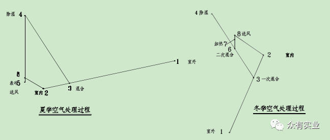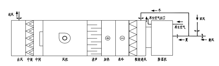 此系統(tǒng)中,夏季:溫度為 Tw 濕度為 RHw 的室外風經(jīng)與室內(nèi)風經(jīng)一次回風混合后,達到某一狀態(tài)點3,進入轉(zhuǎn)輪除濕機,其出風狀態(tài)點為 4(Rho 小于 4%,T 達到 43℃左右),然后再經(jīng)過表冷器干冷處理后達到狀態(tài)點 5,經(jīng)風機溫升達到狀態(tài)點 6 后送入室內(nèi),以保證室內(nèi)狀態(tài)參數(shù) Tn,RHn。冬季:溫度為 Tw, 濕度為 RHw 的室外風經(jīng)與室內(nèi)風經(jīng)一次回風混合后,達到某一狀態(tài)點 3,取一部分回風進入轉(zhuǎn)輪除濕機,其出風狀態(tài)點為 4(Rho 小于 4%,T 達到 43℃左右),再與未經(jīng)過除濕機的回風經(jīng)二次回風混合后達到混合點 6,然后經(jīng)蒸汽加熱器處理后達到狀態(tài)點 7,經(jīng)風機溫升達到狀態(tài)點 8 后送入室內(nèi),以保證室內(nèi)狀態(tài)參數(shù) Tn,RHn。此類系統(tǒng)可以提供 RHn=2%~30%的環(huán)境參數(shù),常用于濕度要求較高的系統(tǒng)。