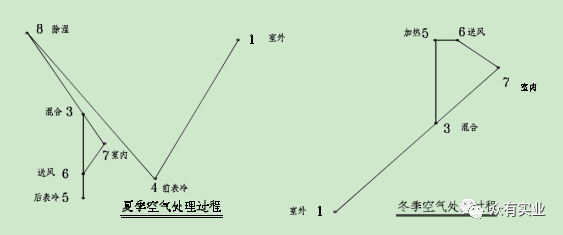 此系統(tǒng)中,夏季:溫度為 Tw 濕度為 RHw 的室外風(狀態(tài)點 1)經(jīng)與冷凍除濕后,達到某一狀態(tài)點4,進入轉(zhuǎn)輪除濕機,其出風狀態(tài)點為 5(Rho 小于 4%,T 達到 43℃左右),與室內(nèi)狀態(tài)點混合達到狀態(tài)點 3,然后經(jīng)過表冷器干冷處理后達到狀態(tài)點 5,經(jīng)風機溫升達到狀態(tài)點 6 后送入室內(nèi),以保證室內(nèi)狀態(tài)參數(shù) Tn,RHn。冬季處理流程與常用的一次回風處理流程相同。此類系統(tǒng)可以提供 RHn=30%~40%的環(huán)境參數(shù),常用于濕度要求較低、冷凍除濕達不到要求的場合。