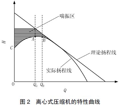 由于離心式制冷壓縮機的葉輪都是后向型,β2 <π/2,所以理論揚程曲線是一條單調遞減的直線;考慮壓縮機的損失,包括機械損失、容積損失、摩擦損失、沖擊渦流損失等,離心式制冷壓縮機的理論性能曲線和實際性能曲線如圖2所示。其中A 點為實際揚程最高點。機組運行在0到QB 區域內,QA 點的附近是最佳工作區。高于實際揚程線的外部區域就是喘振區域。