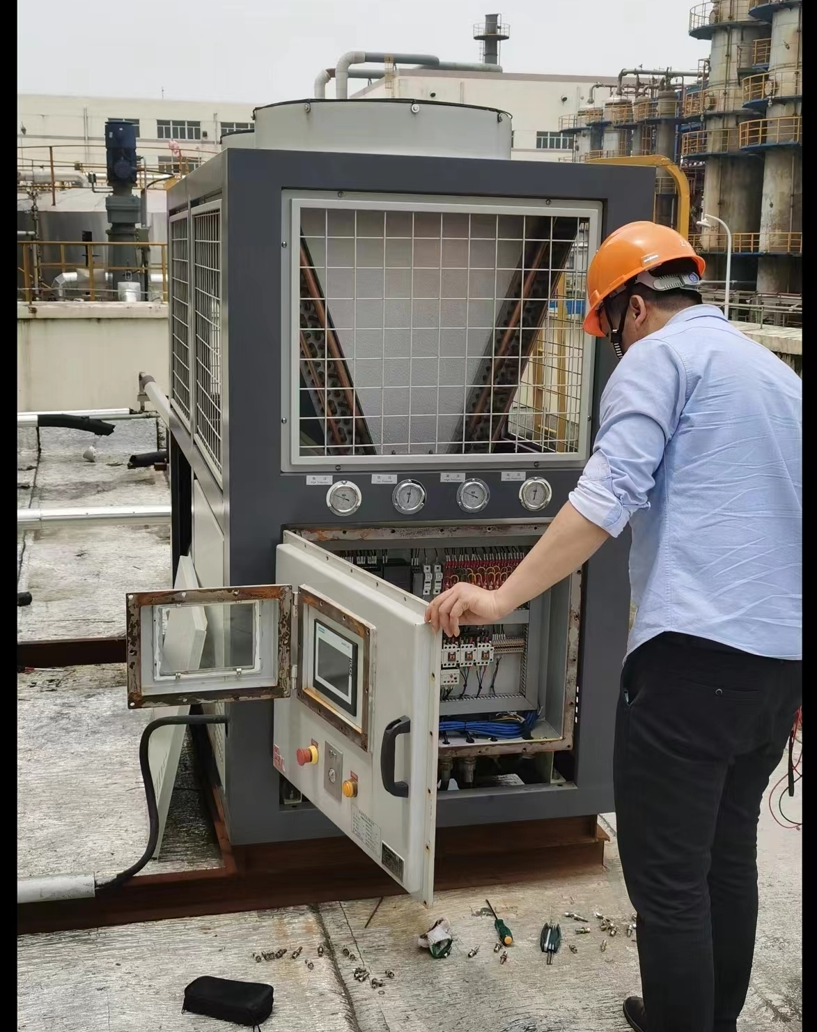 寧波順澤橡膠有限公司選購了我司的一臺LSFX82工業(yè)型防爆型風(fēng)冷箱式冷水機(jī)組。