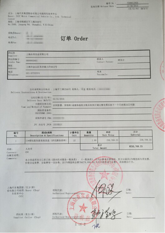 上海汽車集團(tuán)股份有限公司商用車技術(shù)中心向上海眾有實(shí)業(yè)有限公司下采購訂單